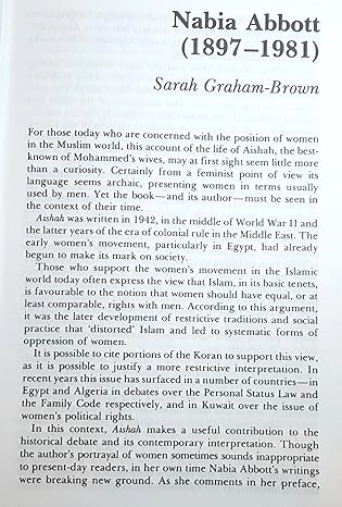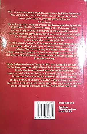 The story of Aishah, the Prophet Mohammed's favourite wife. The text tells of how she lived several decades after Mohammed's death and was deeply involved in the political conflict and civil war that shaped the early Muslim state. There is much controversy over the number of wives attributed to the Prophet Mohammed: various claims range from four to nine or more. On one point, however, everyone agrees: Aishah was his favourite. The story of this remarkable woman has been concealed or ignored for generations. She lived for several decades after the Prophet's death and was deeply involved in the turbulent political conflict that shaped the early Muslim nation. Certainly, Aishah did not conform to any proscription against women in Islamic public life. Having extensively mined scholarly Arabic source material, Abbott nonetheless tells her story in a popular,narrative style. Aishah is not only a gripping tale, but also an attempt to recover part of the lost history of Muslim women who resisted the restrictions Islam sought to impose on them.